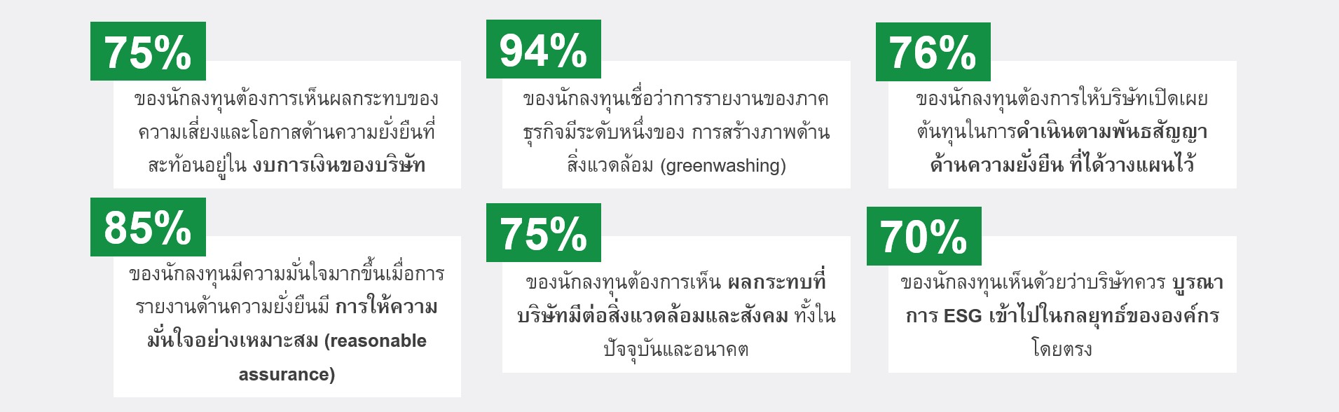 ผลสำรวจด้านล่างนี้สะท้อนให้เห็นอย่างชัดเจนว่า ผู้มีส่วนได้ส่วนเสียต่างคาดหวังให้องค์กรเปิดเผยข้อมูลด้าน ESG อย่างโปร่งใส มีประสิทธิภาพ และสามารถตรวจสอบได้ เพื่อสร้างความมั่นใจในระยะยาว