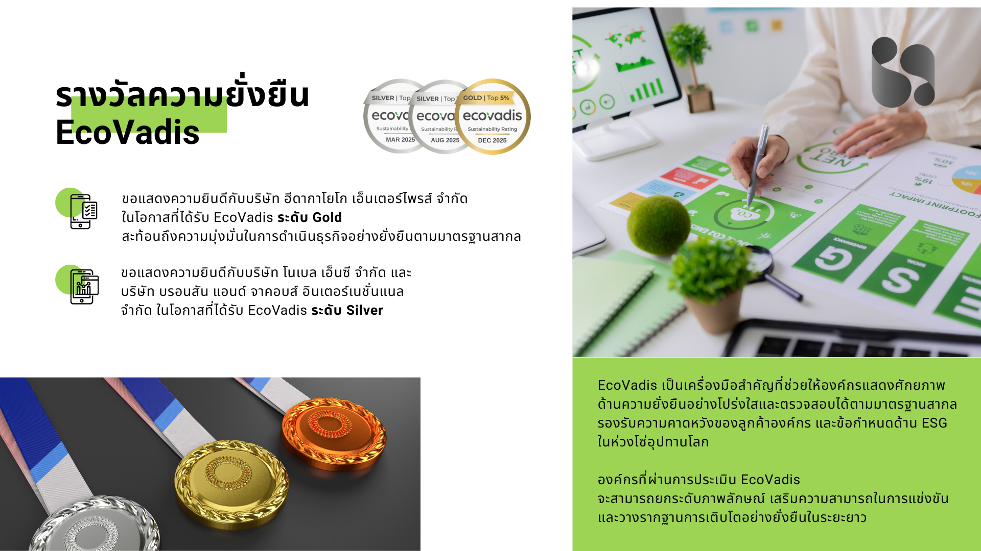 มุ่งเน้นการสนับสนุนองค์กรในการเตรียมข้อมูลและพัฒนาระบบการบริหารจัดการด้านความยั่งยืน ให้สอดคล้องกับเกณฑ์การประเมินของ EcoVadis ซึ่งเป็นมาตรฐานที่ได้รับการยอมรับในระดับสากล และมีบทบาทสำคัญในห่วงโซ่อุปทานโลก